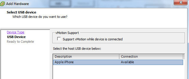 OK, so I plugged in my iPhone into one of my home server’s USB 2.0 ports. Within vCenter, I configured my VM and added a USB controller and then a USB device. vSphere automatically detected the iPhone! Yay!