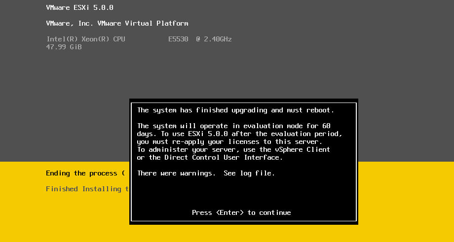 At the end of the upgrade I had the following message on the ESXi host.  So you have to press Enter for the host to restart.  Which is why you need AMM/IMM or physical access to the host to complete the upgrade.