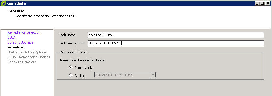 Once the baseline is attached, select it in VUM and click Remediate…   I’ve listed the various screen’s you’ll see during the Remediate wizard below.