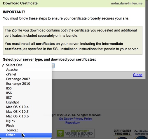 - Now for the certificate for device to IEM server communication, we need to create a certificate request that a certificate authority can process. I was using Godaddy to define a certificate for the domain name mdm.darrylmiles.me. On a Mac I used OpenSSL I would run this command:openssl req -new -newkey rsa:2048 -nodes -keyout yourdomain.key -out yourdomain.csr