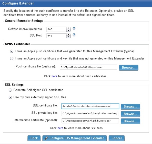 mdm.darrylmiles.me.crt to mdm.darrylmiles.me.cer - I copied the darrylmiles.me.key, mdm.darrylmiles.me.crt and mdm.darrylmiles.me.cer to the IEM server to a directory called D:\ManagementExtender\Cert\