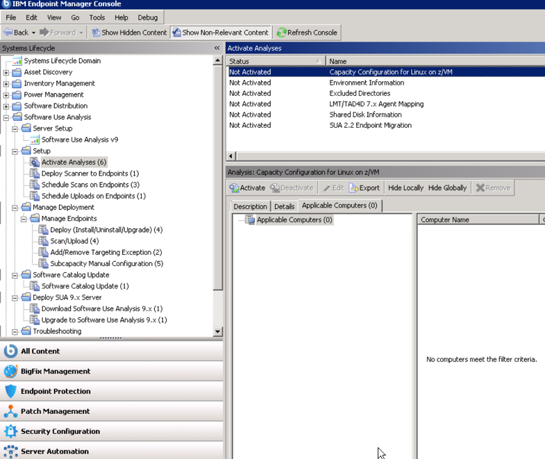 - From the IEM console, select System Lifecycle. Then select Software Use Analysis, select Setup – Activate Analysis. You should see seven Analysis as shown in the example below. Activate each of these.
