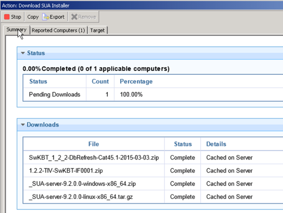 - SUA 9.2 will then show you the following screen as it downloads the SUA 9.2 software and then mirrors it to that server. In my lab environment this took about 10 minutes. You can check the progress of the download by looking at the running Actions too: