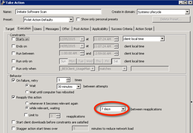 - Select Setup – Schedule Scans on Endpoints. Select Initiate Software Scan. Select Target and select Dynamic target by property and select All Computers. Select the Execution tab. By default the scanning process will run every 7 days as shown below. You can change this value if you like. Select OK when complete.