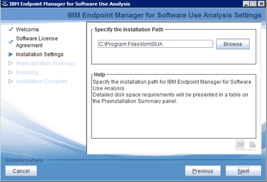 - During the SUA 9.2 installation, select the default including accepting the license agreement. Change the default installation path if required: