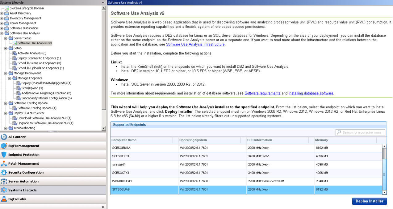 - From the SUA install screen you’ll want to choose a server which will run SUA. For small environments, SUA could run on the same server as IEM. However as you grow beyond several thousand endpoints, you’ll want to dedicate a separate server for SUA 9.2. Select that server and click Deploy Installer.