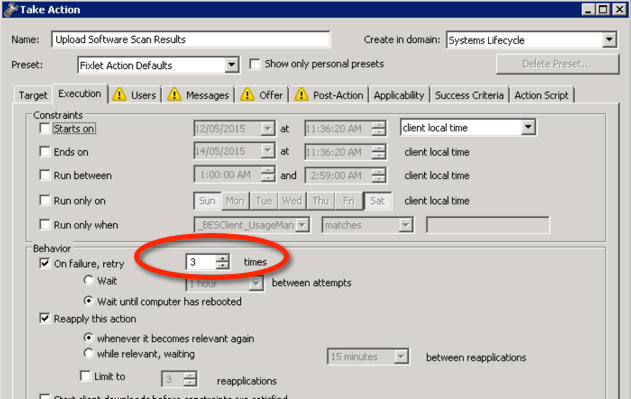 - Finally, select Setup – Schedule Uploads on Endpoints. Select the Upload Software Scan Results fixlet. Click OK to run the Action. Select Target and select Dynamic target by property and select All Computers. Select the Execution tab. You’ll see below the Fixlet will run anytime new scan results are available and retry this 3 times if there is an error. Select OK when complete.
