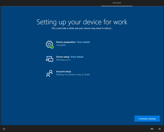 Note: I disabled the option Enable ‘Continue Anyway’ Button on OOBE Status Tracking Page, otherwise I found that as an end user I might Continue Anyway as shown below, before the profile was applied to disable Windows Hello.