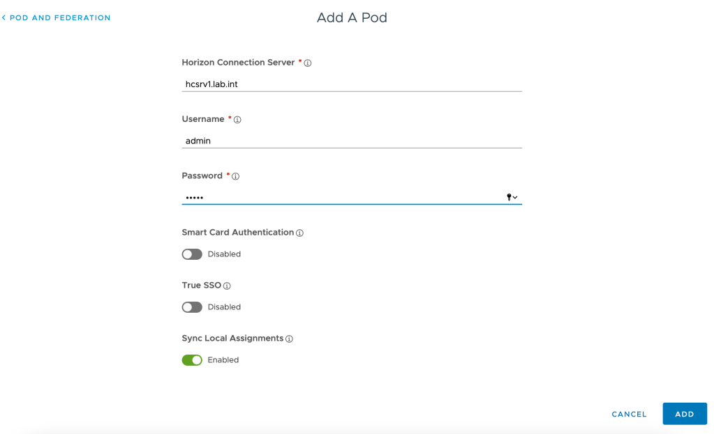 5. Enter your Horizon pod details. My Horizon connection server URL is shown in this example:
