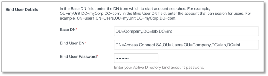 - Enter the Bind User Details for your Active Directory. For example: