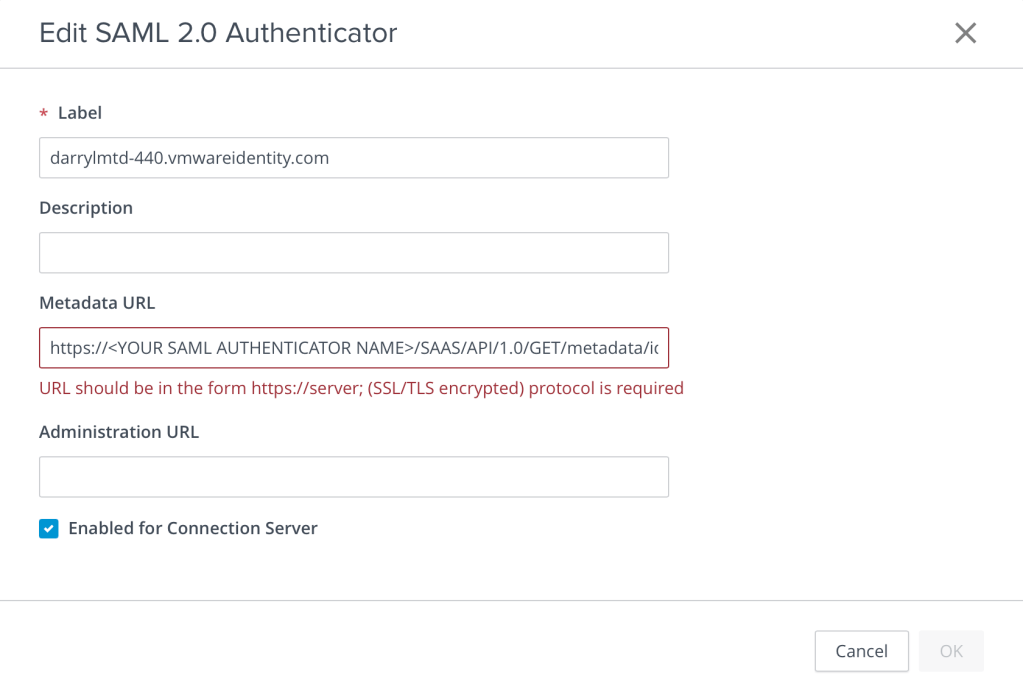 You’ll replace the text <YOUR SAML AUTHENTICATOR NAME> with the DNS name of your Access Server. In my case, I entered darrylmtd-440.vmwareidentity.com