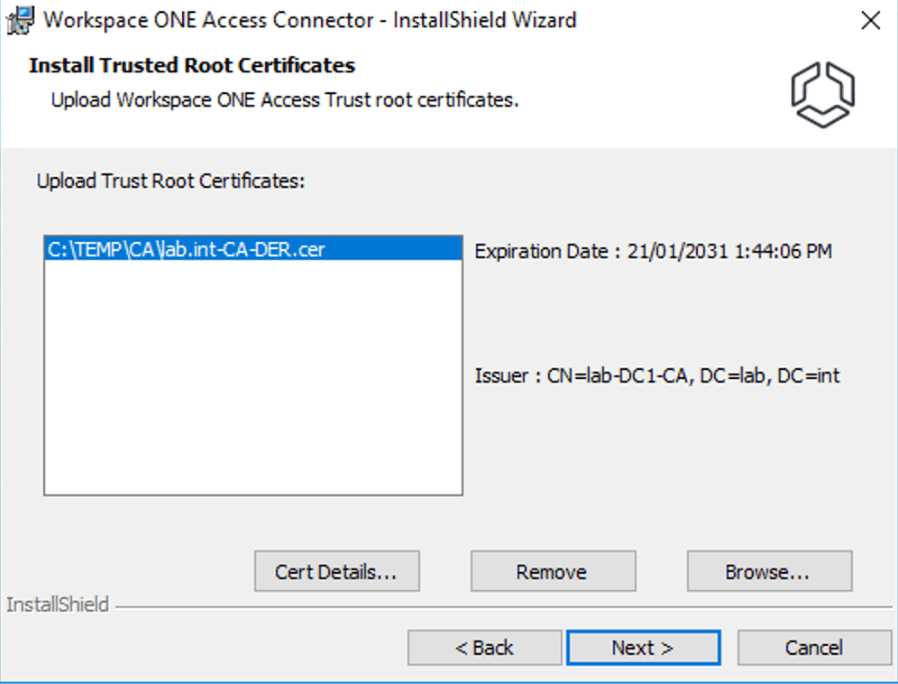 For the new Access 21.08 Connector to work correctly with Horizon, it needs to trust the certificate on Horizon server. This is typically public certificate. If you’re using an internal certificate, it needs to upload the internal root and any intermediate certificates (which we’ll detail below).