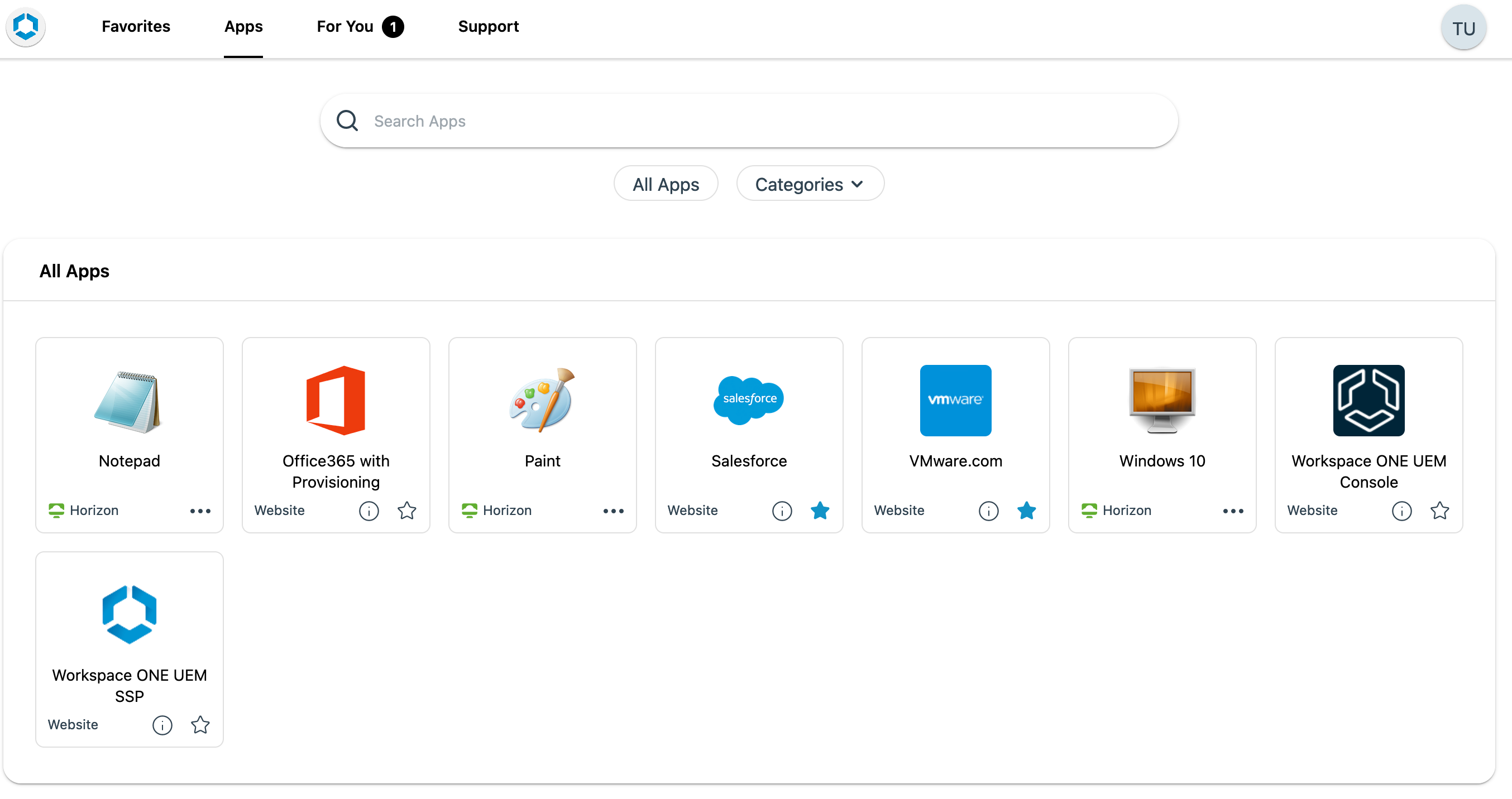 Workspace ONE Access offers a friendly application portal as shown below: