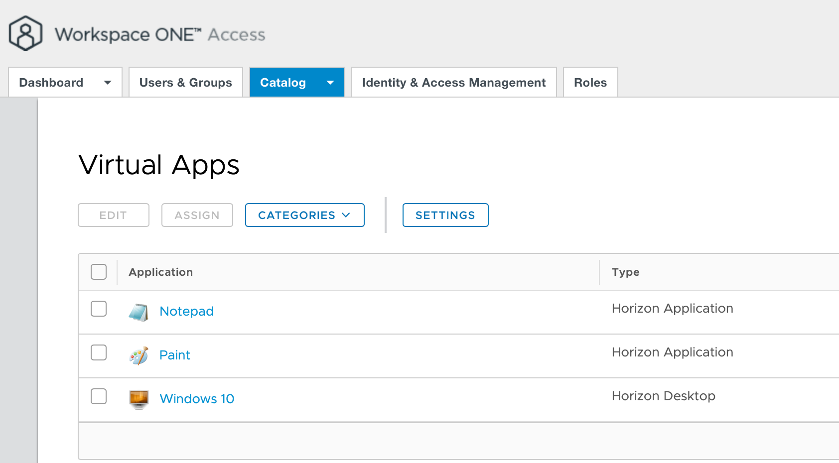 If you now select Catalog – Virtual Apps you should see all of your Horizon on-prem applications similar to the following example: