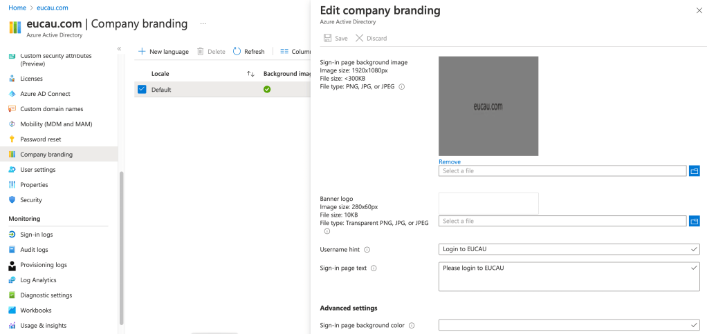 Whilst you’re in the Azure AD portal, you may wish to apply some branding of your tenant so that users are prompted with a personalised message when they enrol their device. Select Company Branding and edit the Default Locale as shown: