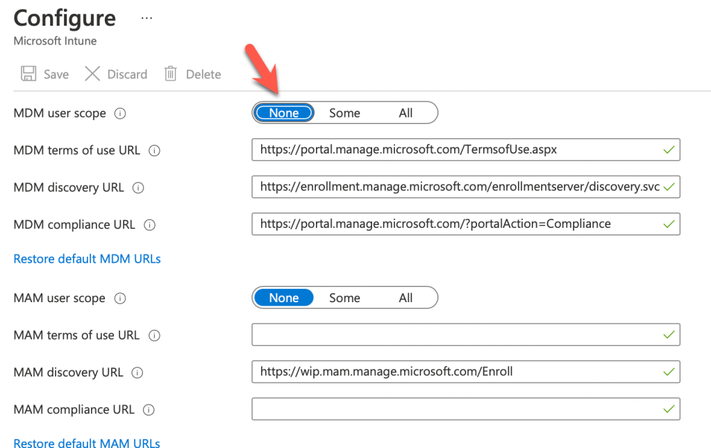If you’re migrating from Microsoft Intune (or a population of your staff are still using it) then it’s important you appropriately set the groups for the Microsoft Intune and Microsoft Intune Enrollment to None or a specific Azure AD group as follows:
