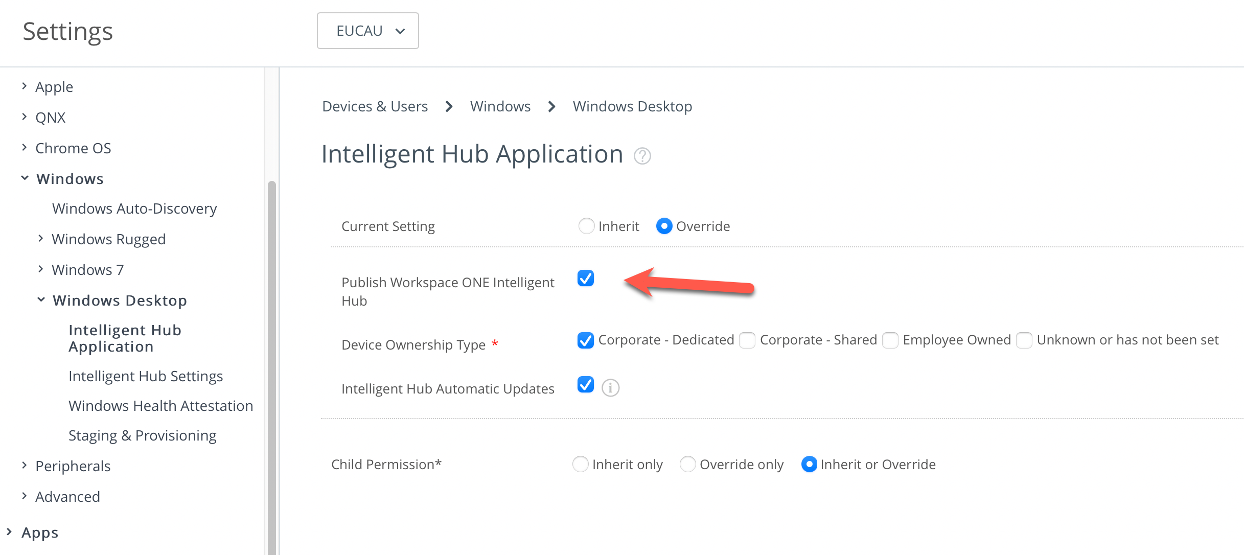 If you don’t see the Hub on your device, ensure that you’ve configured Workspace ONE UEM to publish the Hub. This can be enabled by selecting Groups and Settings > All Settings > Devices & Users > Windows > Windows Desktop > Intelligent Hub Application then enable Publish Workspace ONE Intelligent Hub as shown.