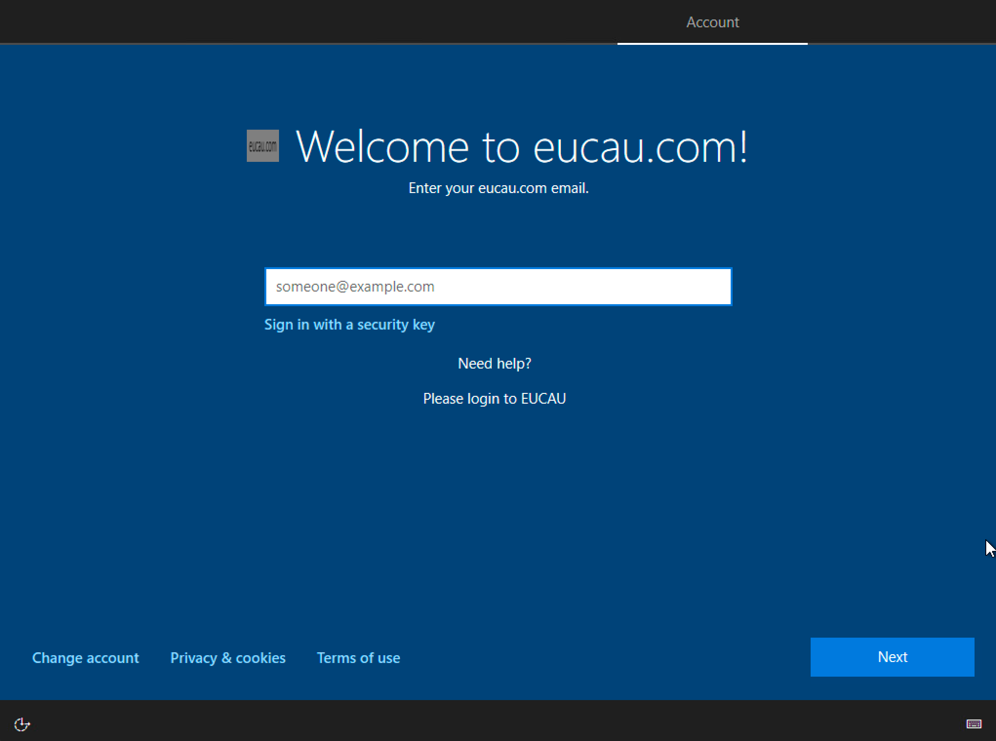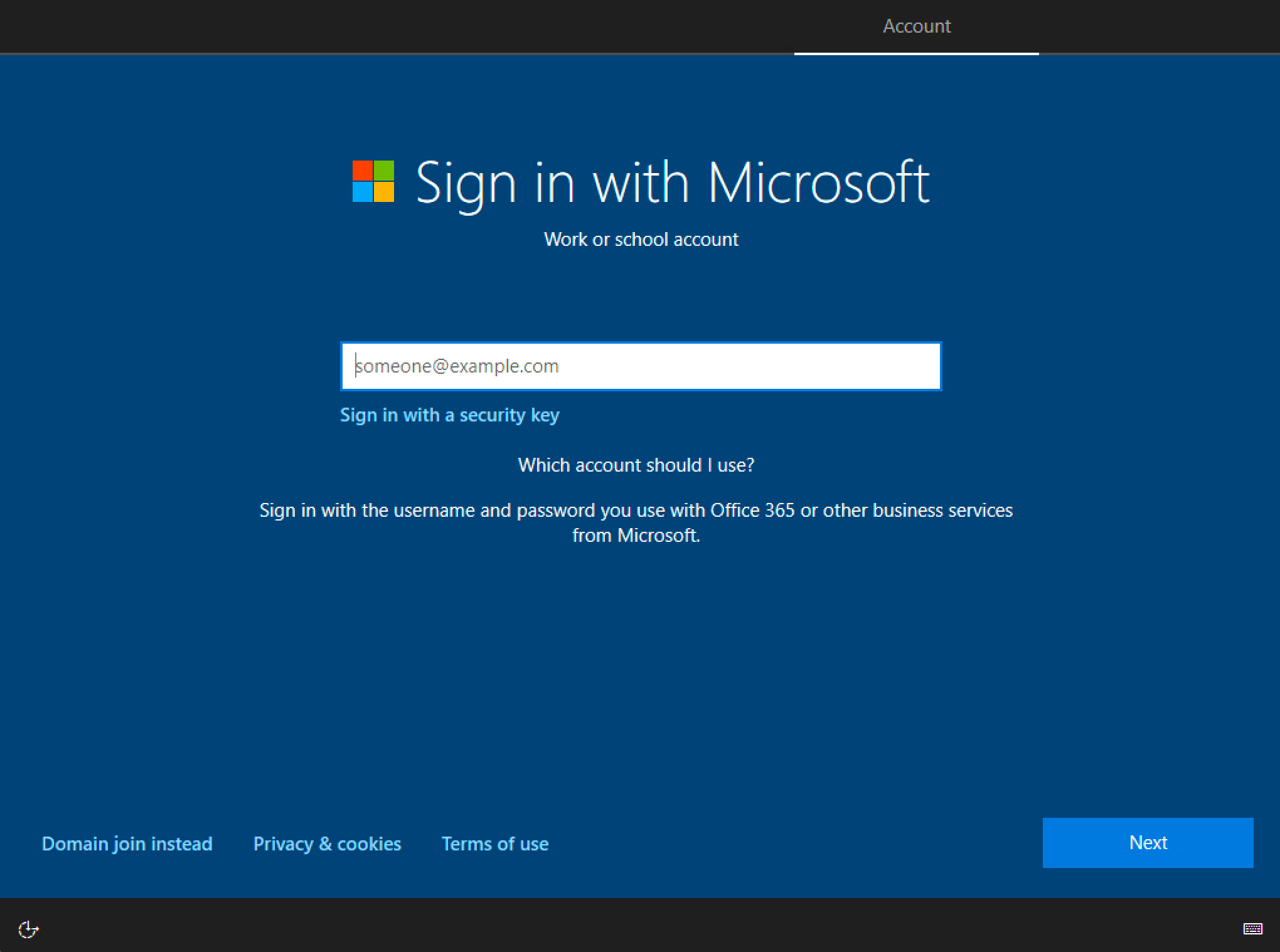 Next build a new Windows 10 (virtual machine is easiest) and when you reach the Sign in with Microsoft, enter your user’s Azure AD userid and click Next