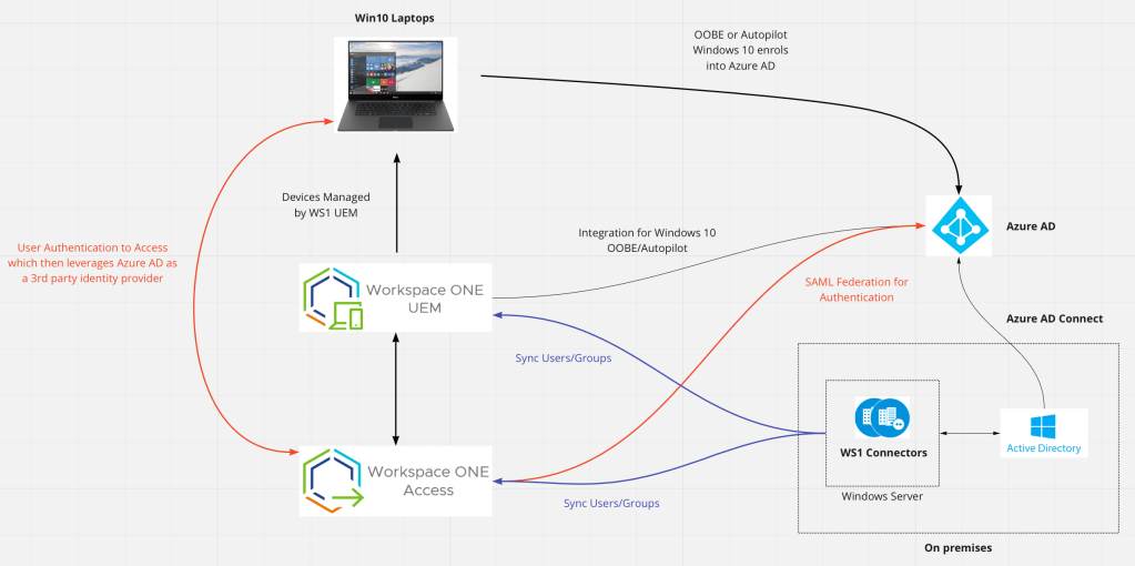 The following architecture diagram in details the various components of how Workspace ONE Access and Workspace ONE UEM is integrated with Entra ID. For the purposes of this article we’ll be focusing only on the integration the integration between Workspace ONE Access and Entra ID.
