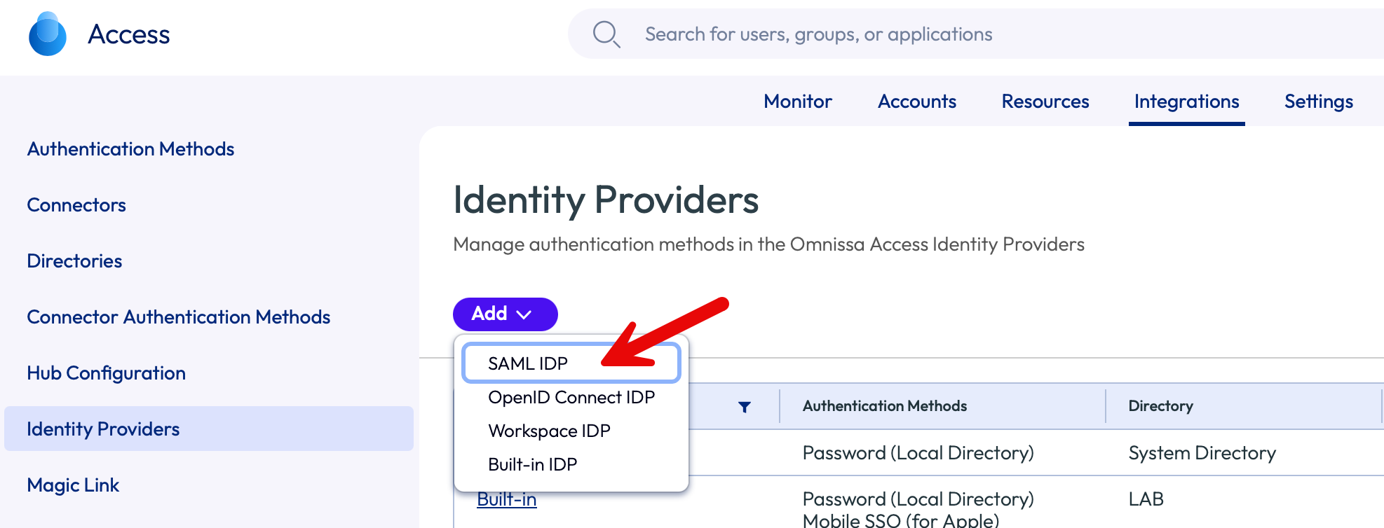 17. Login to the Workspace ONE Access administrator console. Select Integrations – Identity Providers – Add Identity Provider and select Create SAML IDP.