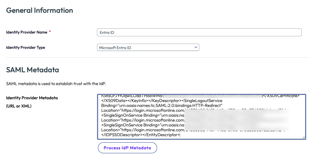 Open the Enterprise Application Metadata XML file (downloaded in step 16 above) in text editor and paste all the contents into SAML Metadata field as shown: