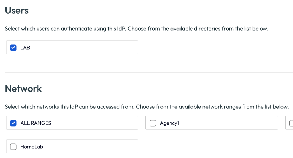19. Select the directory that you have already added to your Workspace ONE Access tenant. In my lab it’s called LAB. Also select the network as ALL RANGES