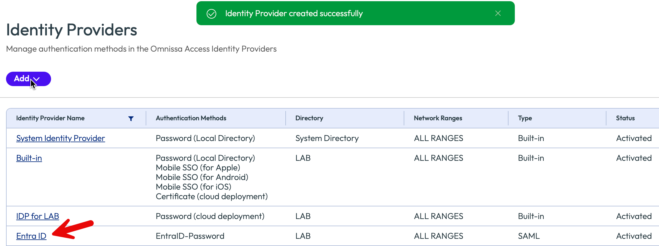 18. Enter the name of your choice to Identity Provider which you are going to create. For example Entra AD. Select the Identity Provider Type of Microsoft Entra ID.