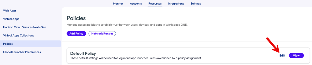 23. Next we’ll update the existing policy to select Azure AD as the authentication method for your users. Select Resources – Policies then click Edit