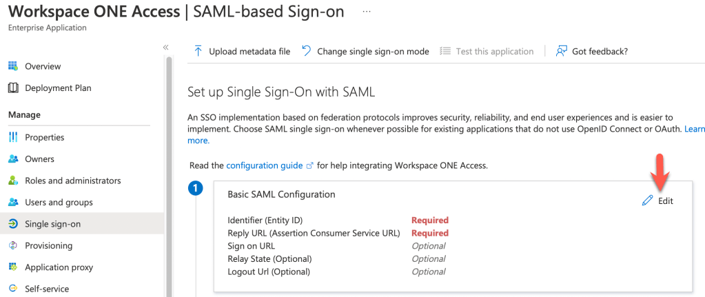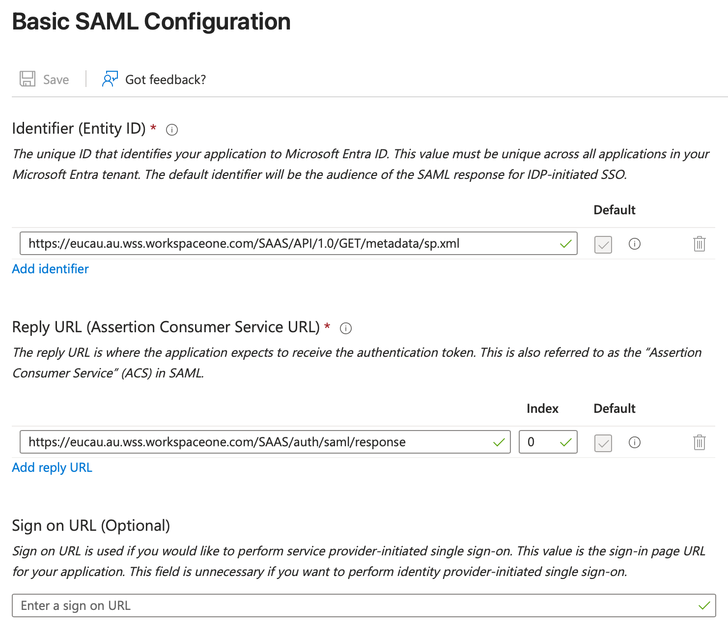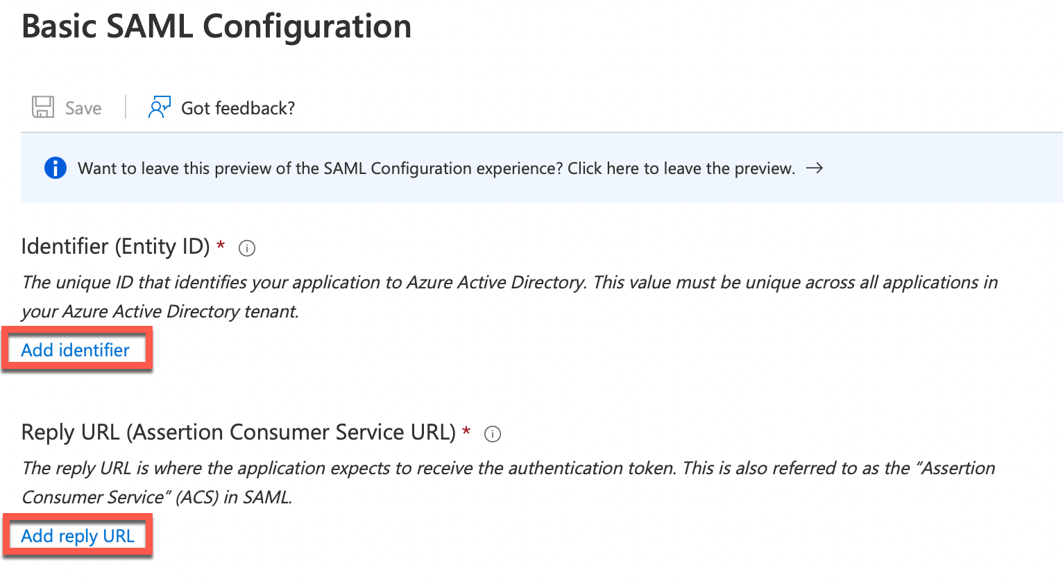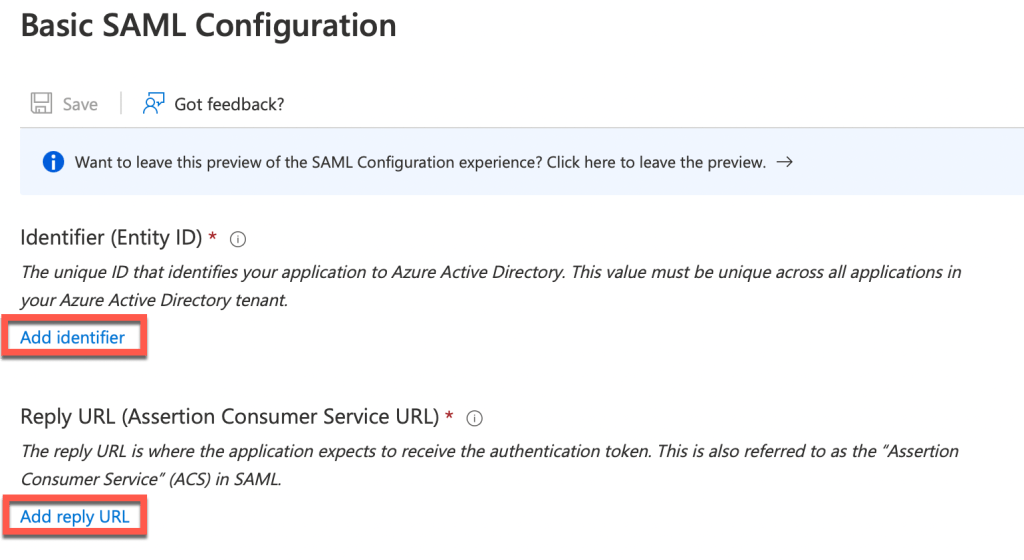 - We’re going to need two items of information for the Basic SAML Configuration. One is the Identifier (Entity ID), the other is the Reply URL as shown: