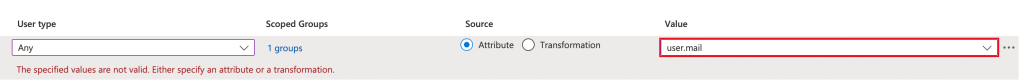 In my lab I selected All Staff. So choose your appropriate group. Next select Attribute and for the value select user.mail. My lab settings are shown below: