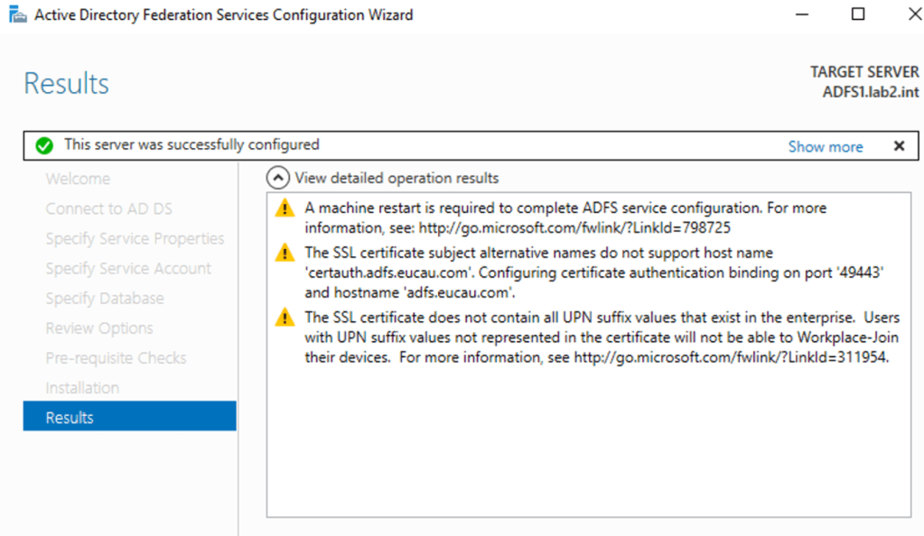I restarted my server. Since my Letsencrypt certificate didn’t support a hostname of certauth.adfs.eucau.com, I followed this article to ensure my firewall and DNS was setup appropriately for port 49443 (TCP) and public DNS name certauth.adfs.eucau.com.