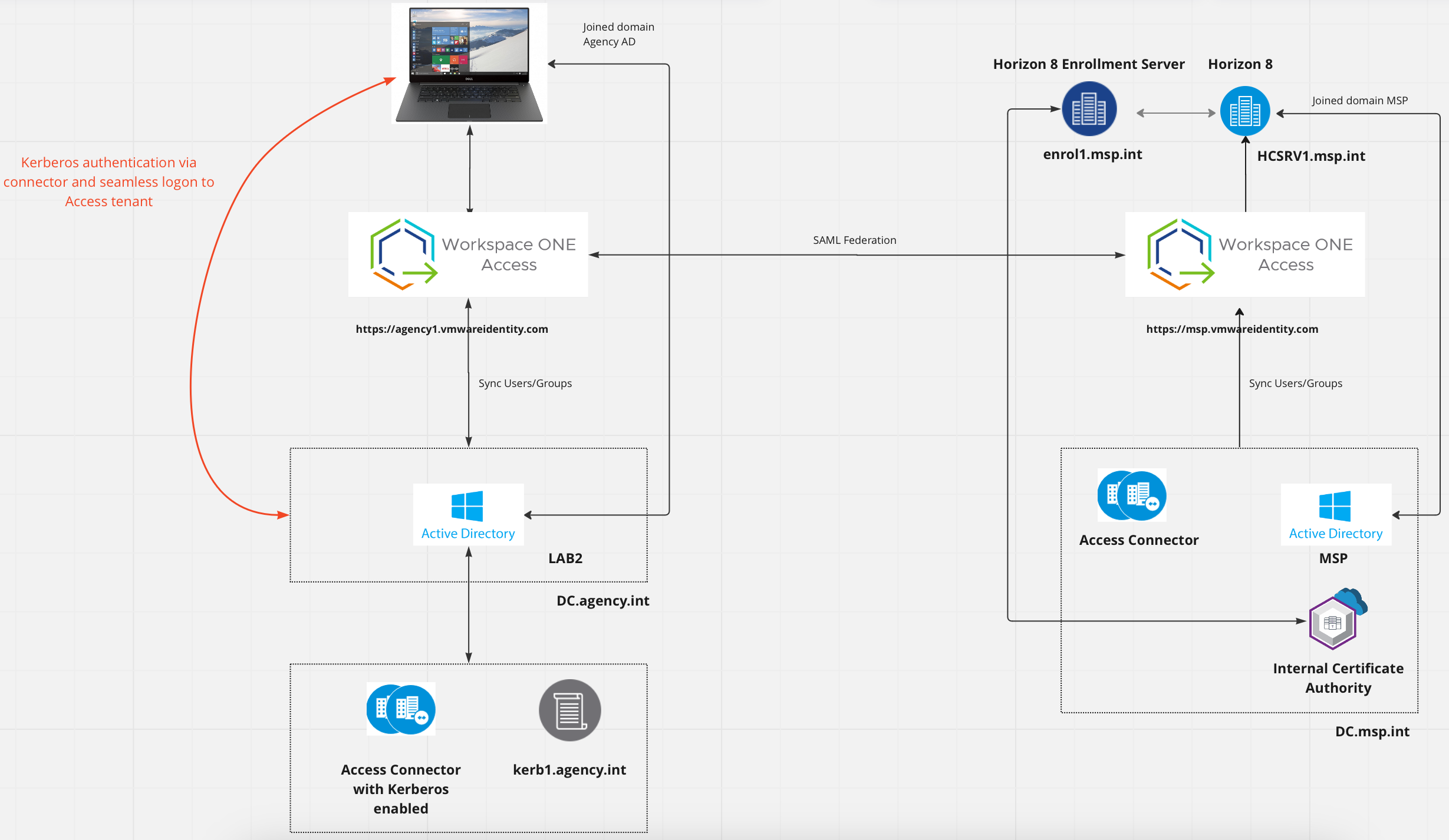 • MSP Access tenant. Connector installed on-prem (setup with Directory Sync, Directory Auth, Kerberos and Horizon Apps)