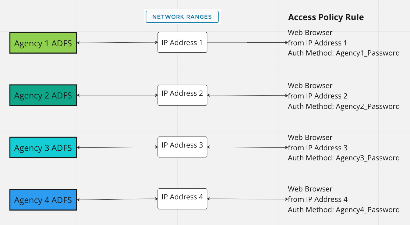 Since multiple Agencies will access this single Access tenant, you’ll need to configure appropriate network ranges within the MSP access tenant. That way, when a user from an Agencies private IP address range attempts to authenticate to the MSP Access tenant, the appropriate authentication method for that agency will be used. For example: