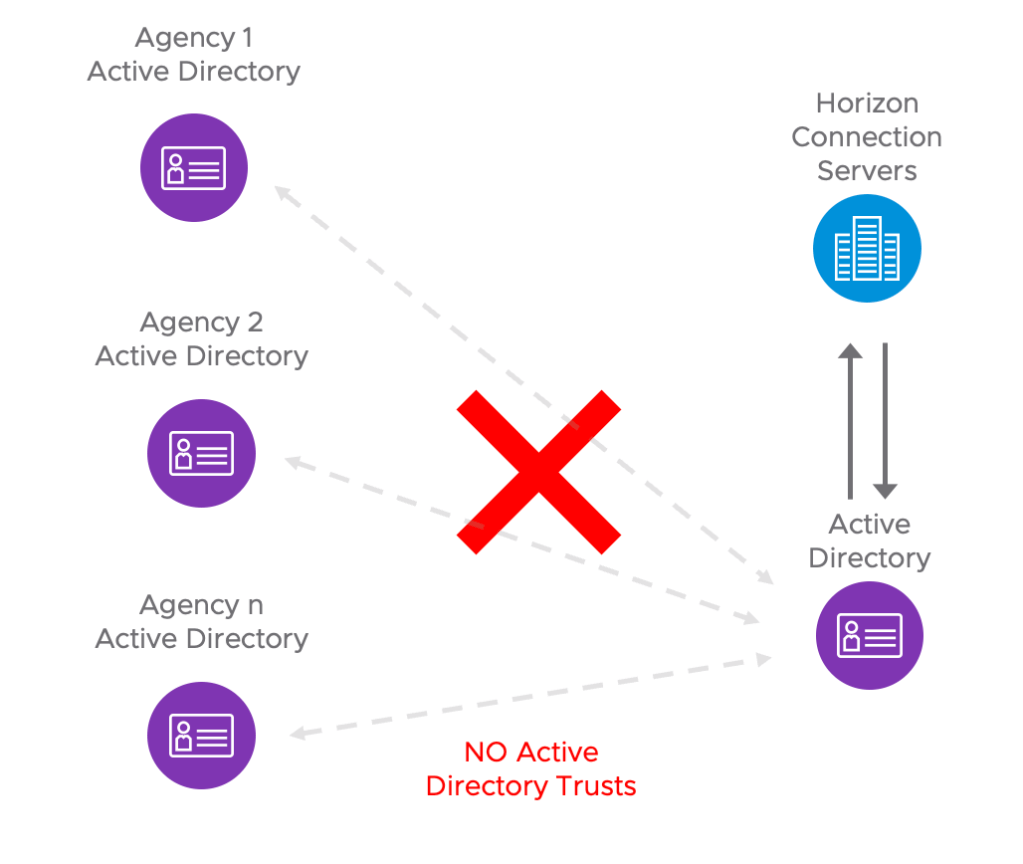 Omnissa Horizon makes the delivery of virtualized desktops and apps easy and secure from on-premises or cloud hyperscalers such as Azure, AWS or Google. Users would typically authenticate to a single Active Directory domain or multiple trusted domains in a single forrest.