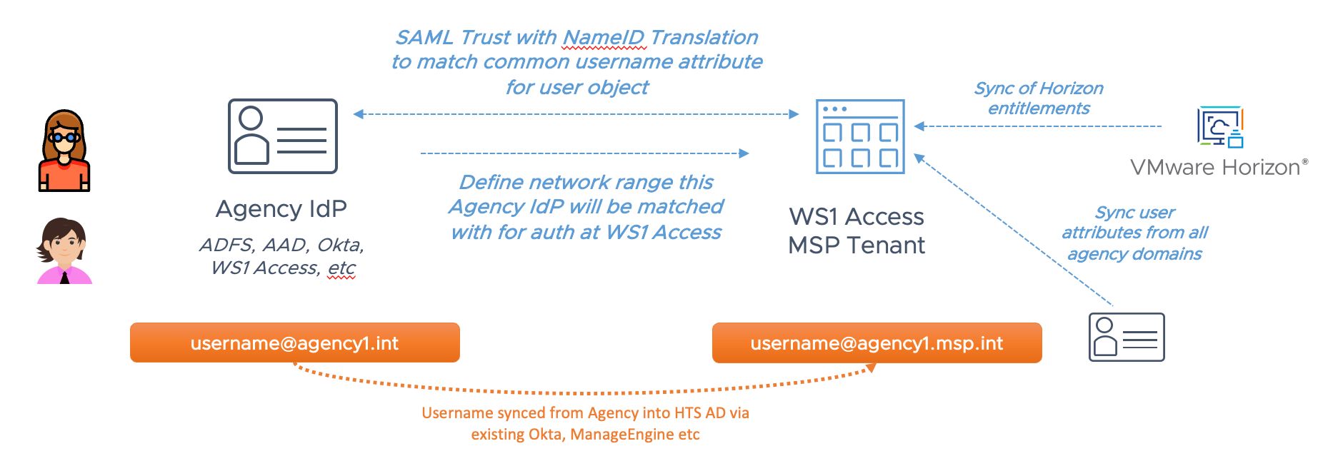For Option B, the Agency is already using Microsoft Active Directory Federation Services (or ADFS). The MSP Access tenant has been setup with True SSO so that even though the user is logging into the Access tenant using SAML, when they launch a Horizon application they are not prompted for their userid or password.