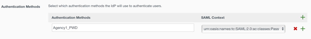 In this example we simply add it as the first one called Agency1_PWD. In our case we will only support idP initiated flow. If you are planning on supporting SP-init flow you must think about the order of authentication (authN) methods.