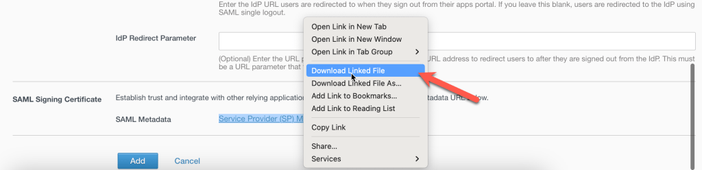 Right click on the SAML Metadata, Service Provider (SP) metadata link and choose Save link as…