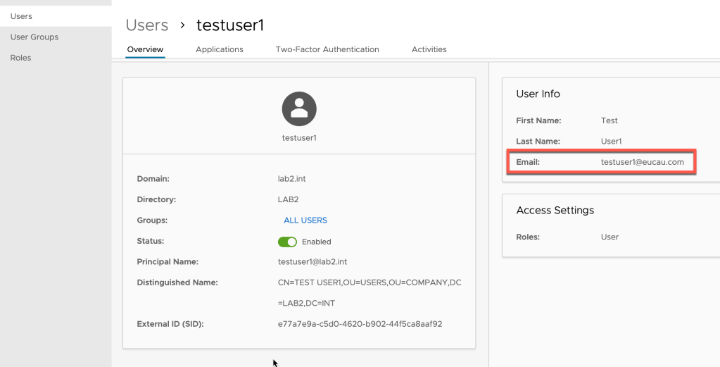 Next step is to make sure you have user objects in both domains sharing the same attribute. We are using the Email attribute as the unique User Identifier. In my lab it is @eucau.com. This should be identical for the MSP and Agency Access tenant. My test accounts’ email address is testuser1@eucau.com, but note the Active Directory Principal name is testuser1@lab.int (for my lab)