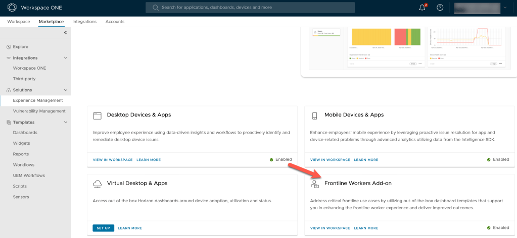 To activate these dashboards, open the Workspace ONE Intelligence console and select Marketplace. Then select Solutions – Experience Management. You can then enable the Frontline Workers Add-on as shown.