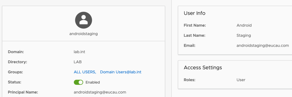 Your first task is to create a userid in your on-premises Active Directory (or in your IdP if you’ve setup VMware Identity Services) and ensure it’s synchronised with Workspace ONE UEM and Access.