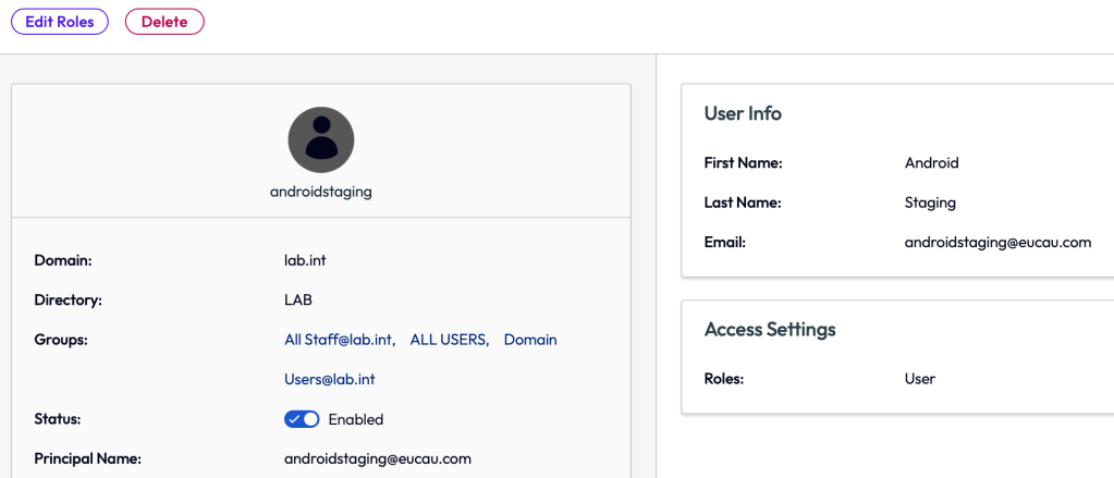 In my lab, I created a user called androidstaging as shown: