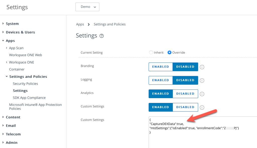 Select Groups&Settings – All Settings – Apps – Settings and Policies – Settings. Then add “CaptureDEXData”:true as follows: