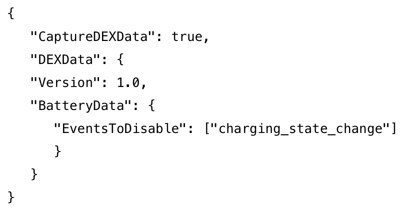 Note: Please see this article on how you can specifically enable/disable collecting information events such as charging state. This would be configured for example as follows: